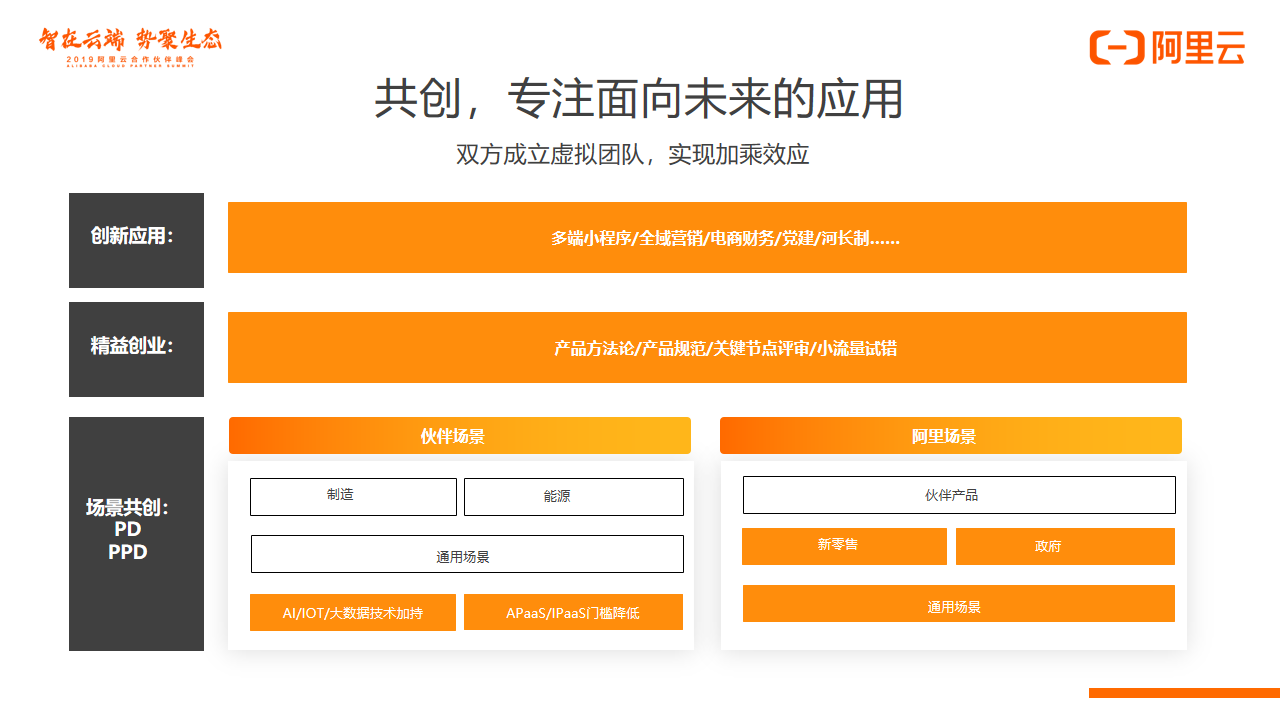在共创过程中,我们会和生态伙伴一起来做产品,把阿里巴巴的产品设计规范赋能伙伴。通过MVP快速迭代,双方进行关键把控点的评审,最后给客户提供具备独特竞争力的小程序,党建,营销等产品。