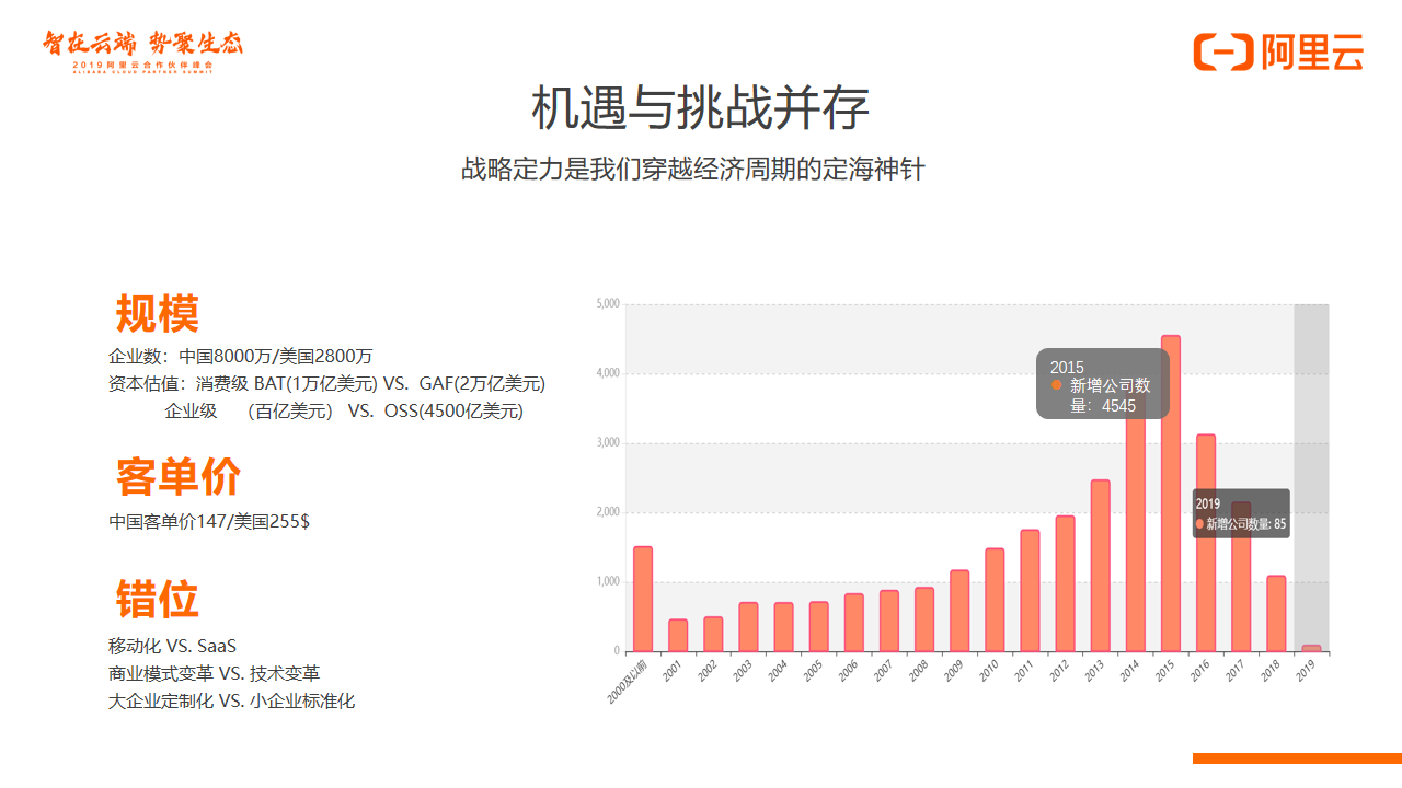 2015年的时候整个中国的资本市场投入了非常多的钱。从而推动一年新增的SaaS公司在五千家。但是到了2019年,我们看到市场里面新增的SaaS有多少家,新增的只有85家。这就是一个现实与理想的冲突。