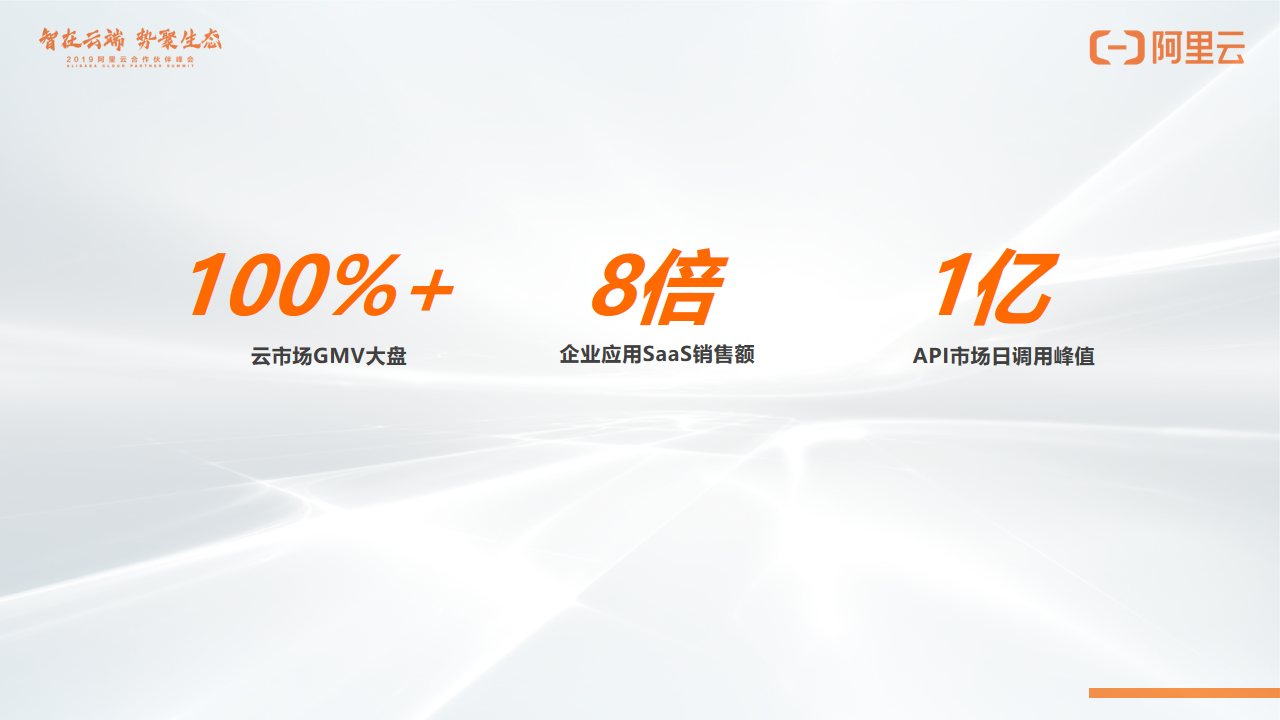 好消息是我们找到了一条阿里云的SaaS业务快速增长之路,有一些数字想和大家分享。整个GMV大盘仍然保持100%的增幅。同时SaaS品类和去年比起来有8倍的增长。因为整个SaaS的快速发展,底层的API市场日调用峰值达到一个亿。我们有幸找到了自己的增长之道,在这儿特别想和大家做一点分享。我们定义这个商业范式叫做阿里云的商业操作系统。