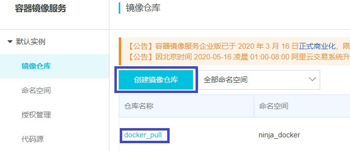 这个配置也很简单,首先登录阿里云,搜索 “容器镜像服务”,进入管理控制台,创建一个镜像仓库,这些都是随便设置,后面关联代码选本地就好