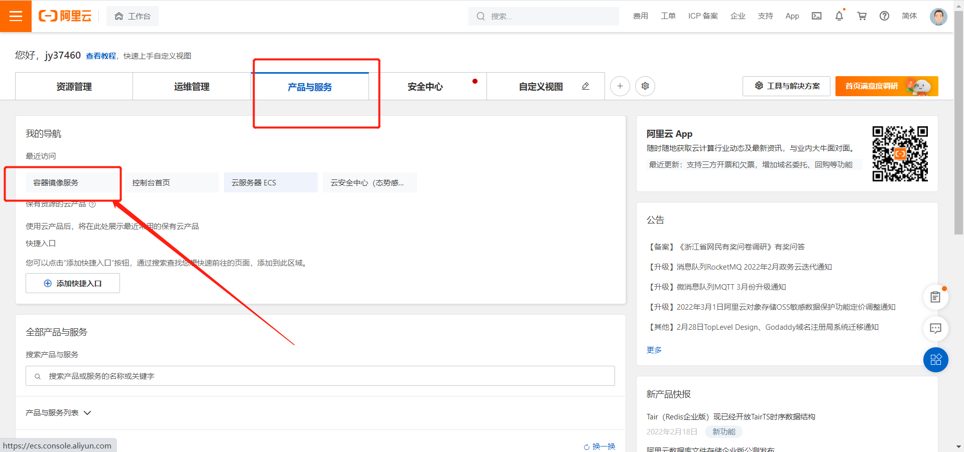首先要去阿里云上面注册一个账号,方法很多,自己随意选择。 然后点击控制台——>产品与服务——>容器镜像服务。 此时会弹出开通容器镜像服务通知并要求提供密码,这个密码自己设置好,用于以后登录