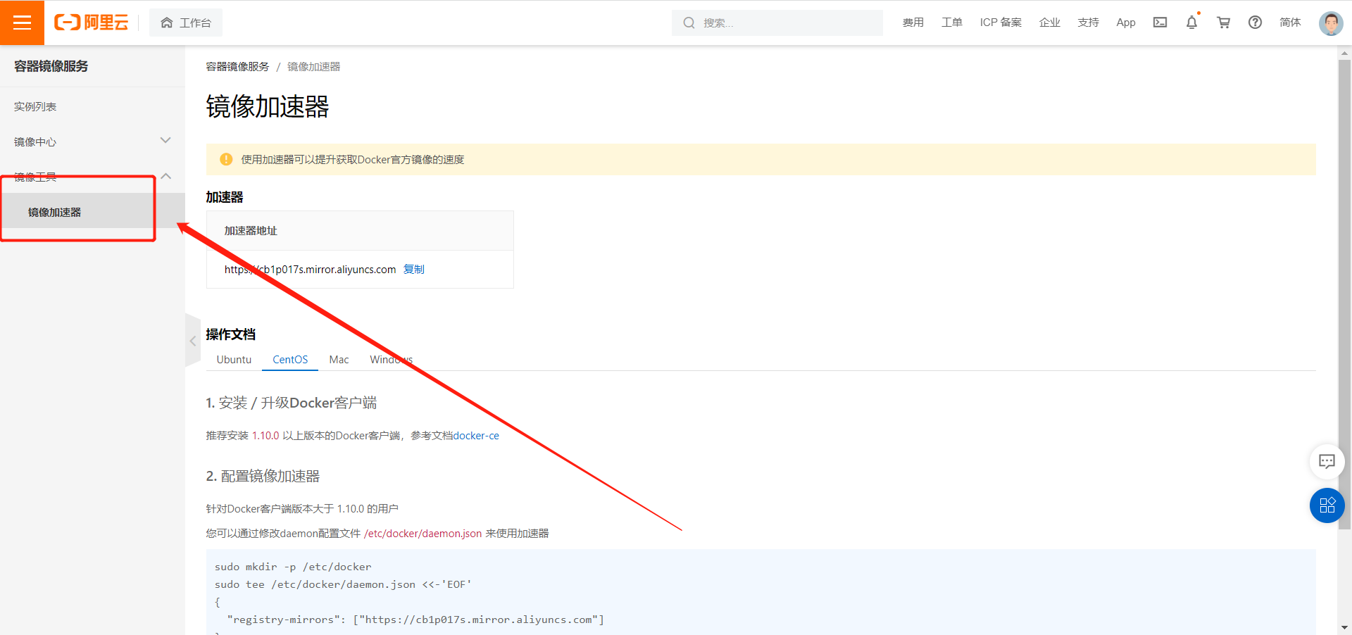 docker客户端使用这个时候已经得到加速器地址了,这个加速器地址是私人的,只能自己使用。