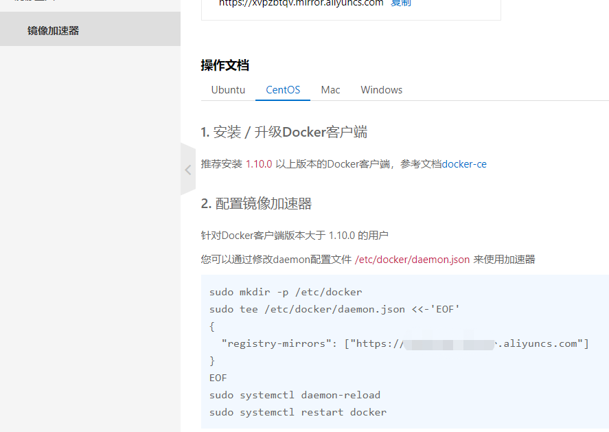 第一步 sudo mkdir -p /etc/docker 第二步 sudo tee /etc/docker/daemon.json <<-'EOF' { "registry-mirrors": ["https://xxxxxx.mirror.aliyuncs.com"] } EOF 第三步 sudo systemctl daemon-reload 第四步 sudo systemctl restart docker